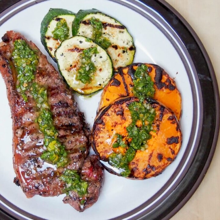 Grilled butternut squash, zucchini and steak with chimichurri sauce