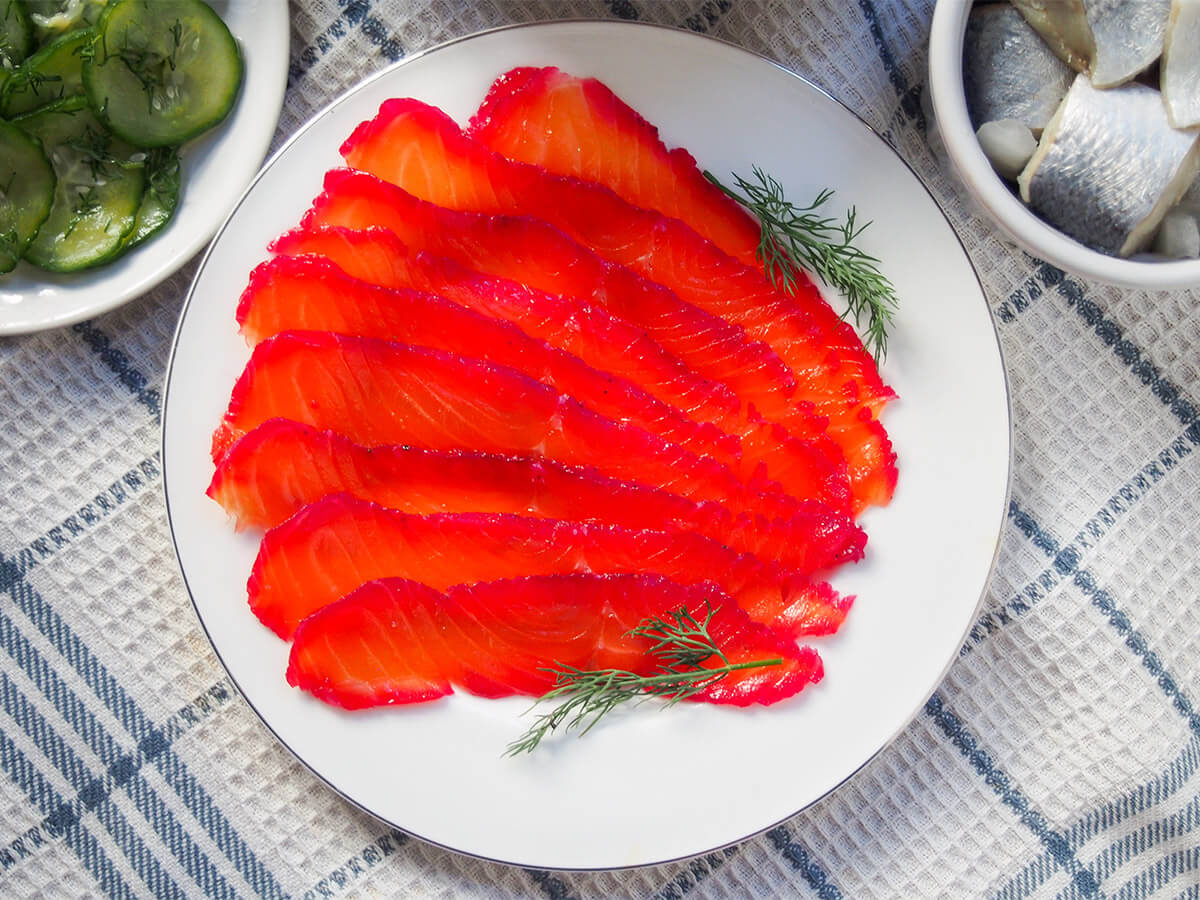 - Drain off the liquid that has accumulated and remove the salmon from the dish. Scrape off the beet and any excess cure (some stray dill is fine) and pat the fish dry. Slice the salmon thinly across the grain, removing any skin, and serve.