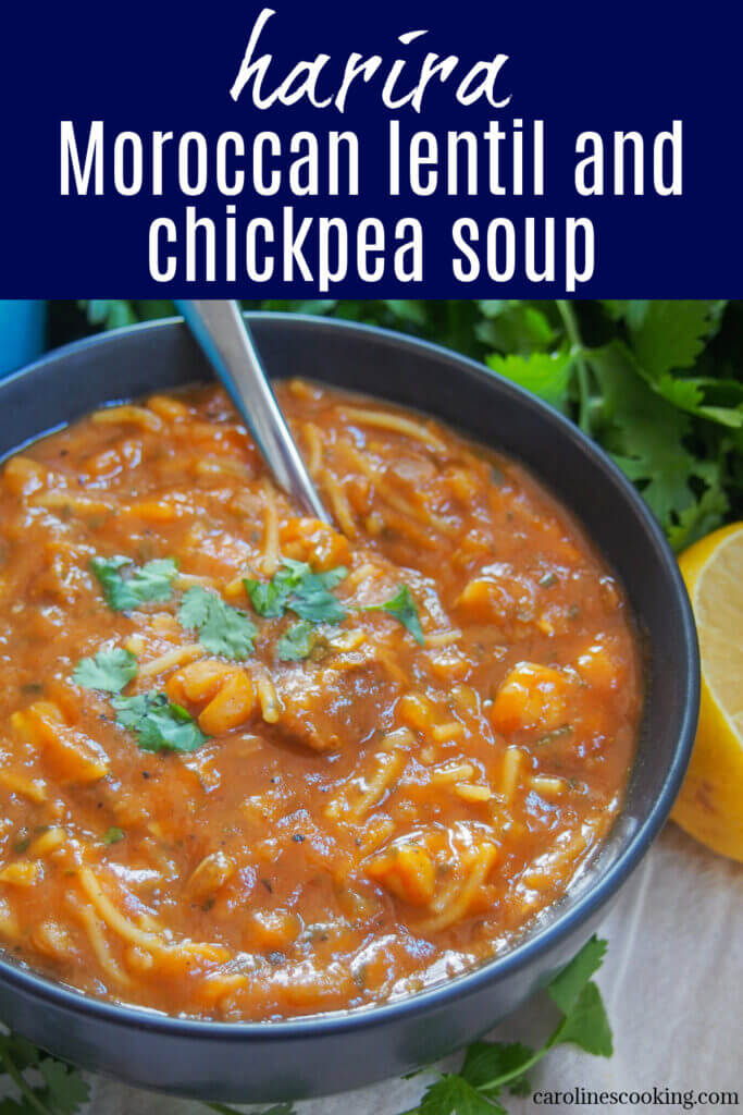 Harira is a traditional Moroccan lentil and chickpea soup that's packed with warm spice flavors. With a tomato base, fresh herbs and ginger for a gentle kick, it's a hearty, comforting and delicious combination.