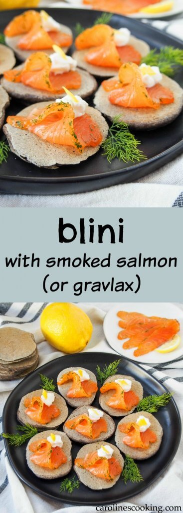These blini with smoked salmon or gravlax are an easy and elegant finger food. They're at the middle of any Russian party table for a reason, as they both look the part and taste great too. Give them a try and you'll see what I mean.